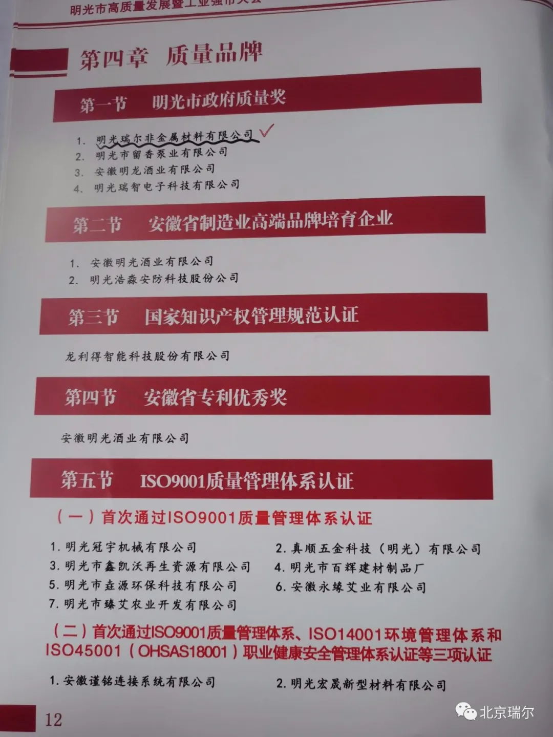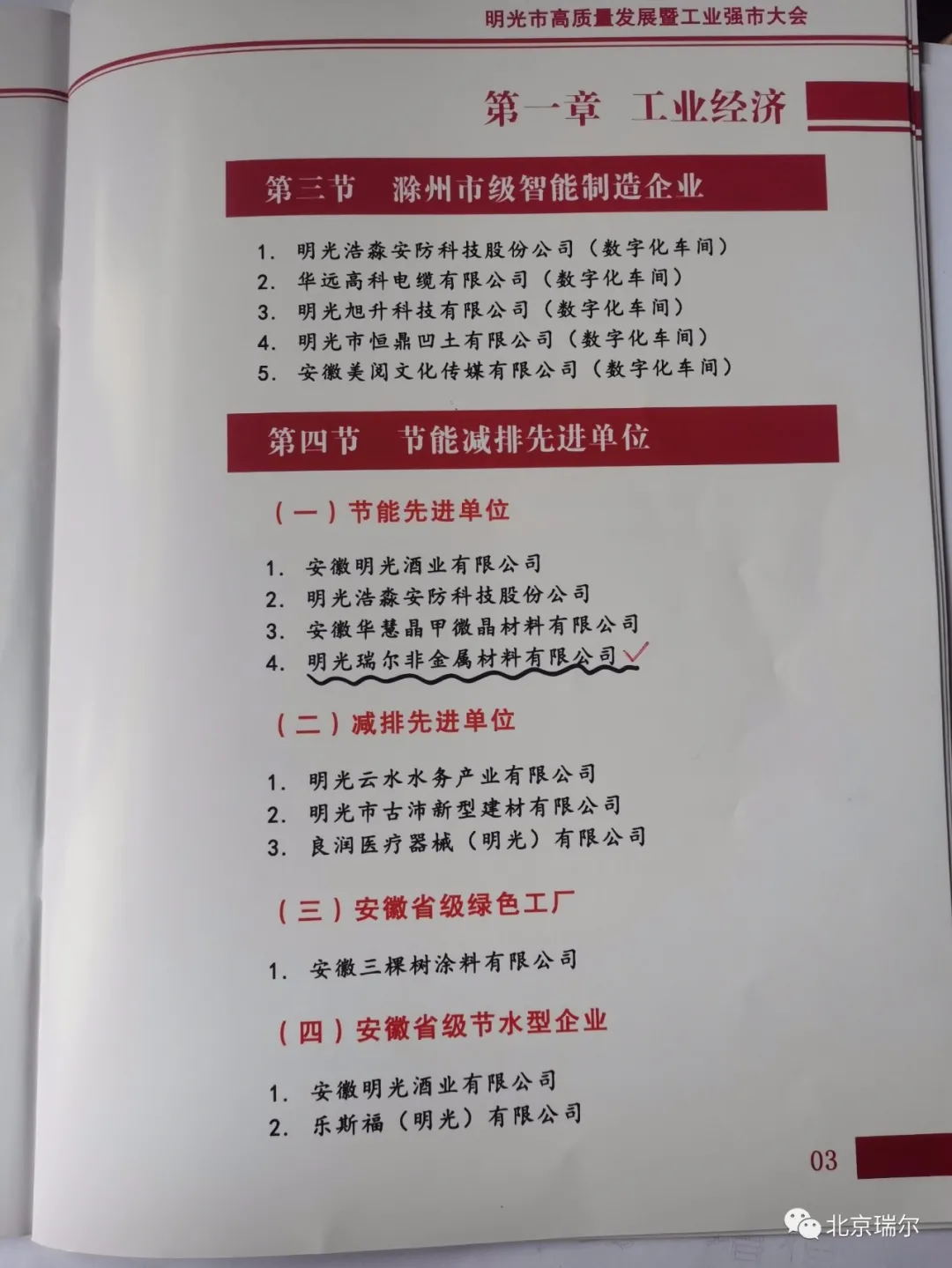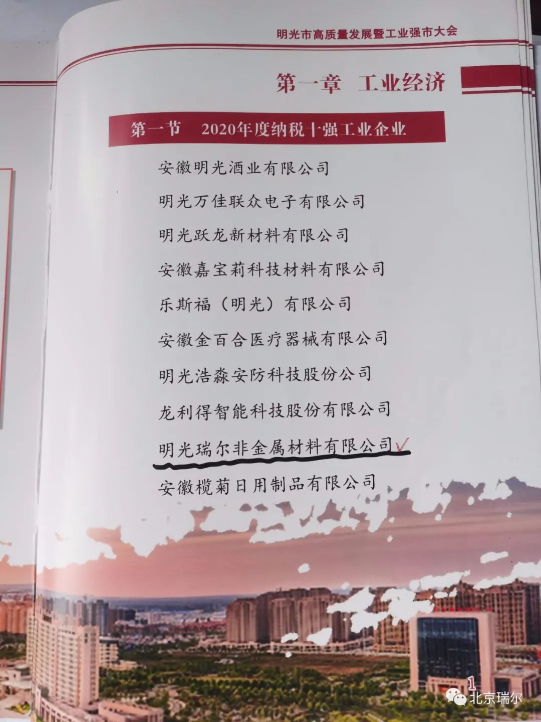 寒雪梅中盡,春風(fēng)柳上歸,在這個乍暖還寒的初春,安徽省明光市高質(zhì)量發(fā)展暨工業(yè)強市大會如期召開。大會隆重表彰了“2020年度納稅十強工業(yè)企業(yè)”、“財政貢獻上臺階企業(yè)”、“節(jié)能減排先進單位”和榮獲“明光市政府質(zhì)量獎”的先進企業(yè)。作為北京瑞爾非金屬材料有限公司旗下企業(yè)的明光瑞爾非金屬材料有限公司,在這本榮譽畫冊中屢屢上榜,頁頁有名!